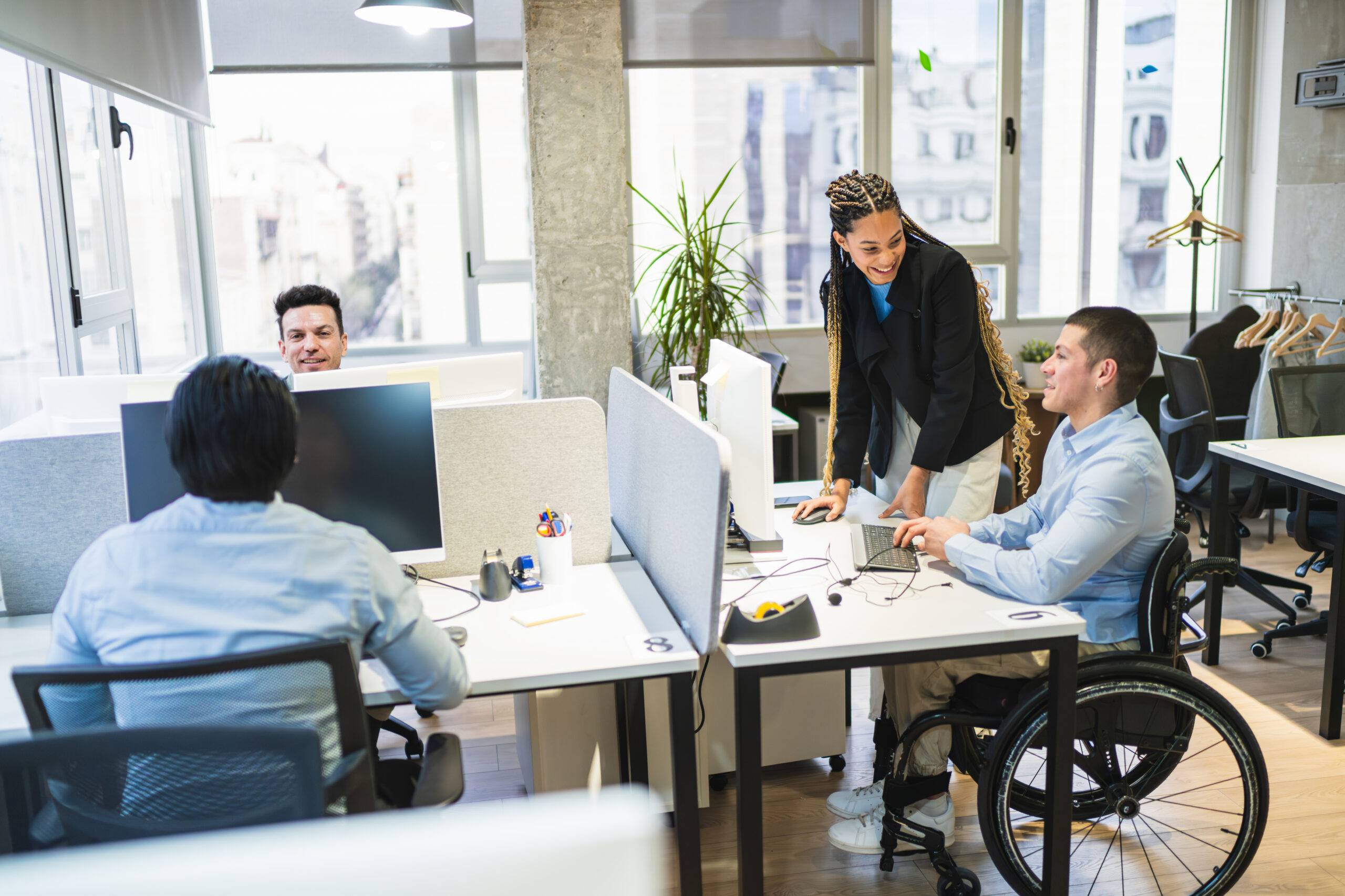 Diverse colleagues working together in a bright, inclusive office, demonstrating teamwork and accessibility