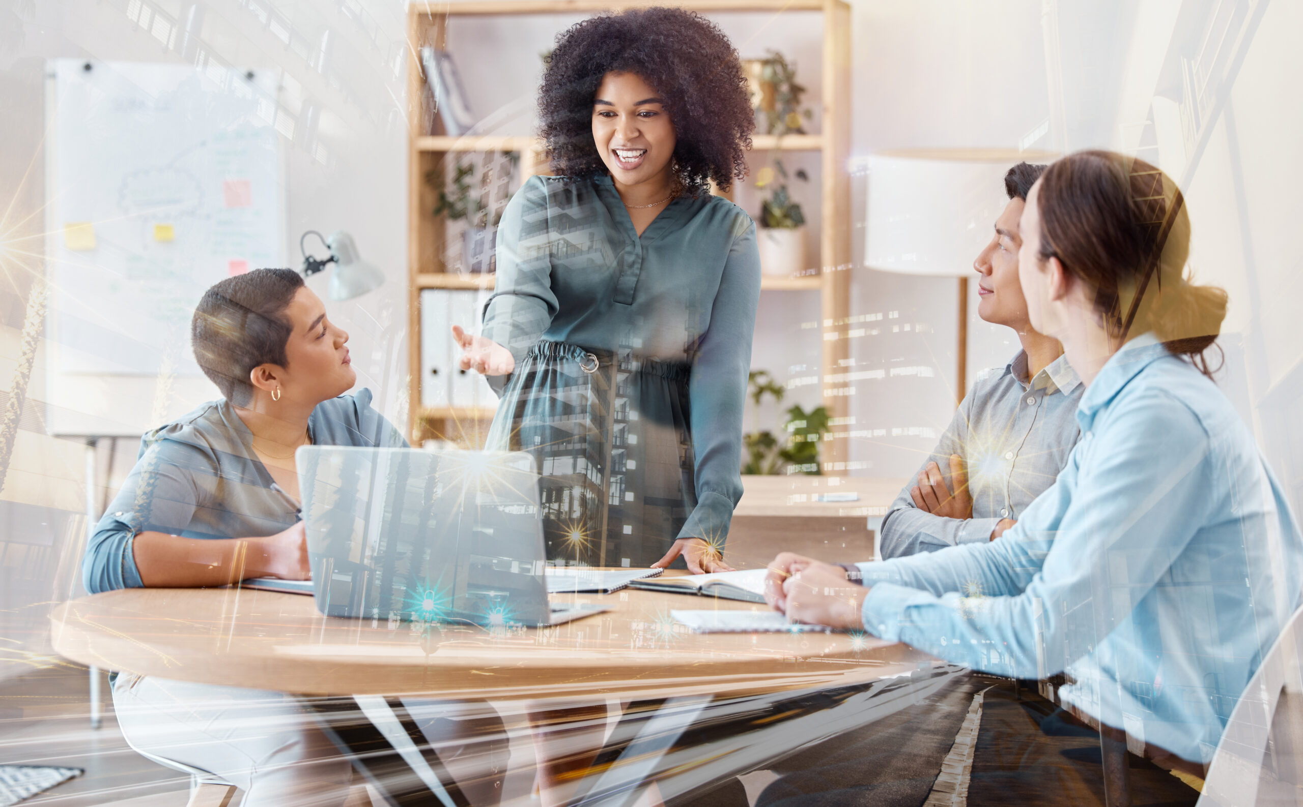 Overlay, planning and digital marketing presentation meeting with teamwork, diversity and innovation for sales growth. Collaboration, laptop and woman talking to business people about startup ideas