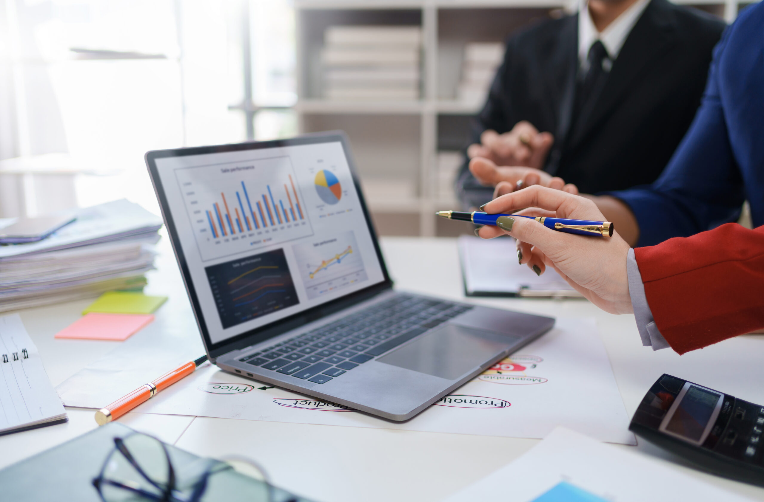 Business professionals collaborating using laptop and documents. Teamwork and corporate concept