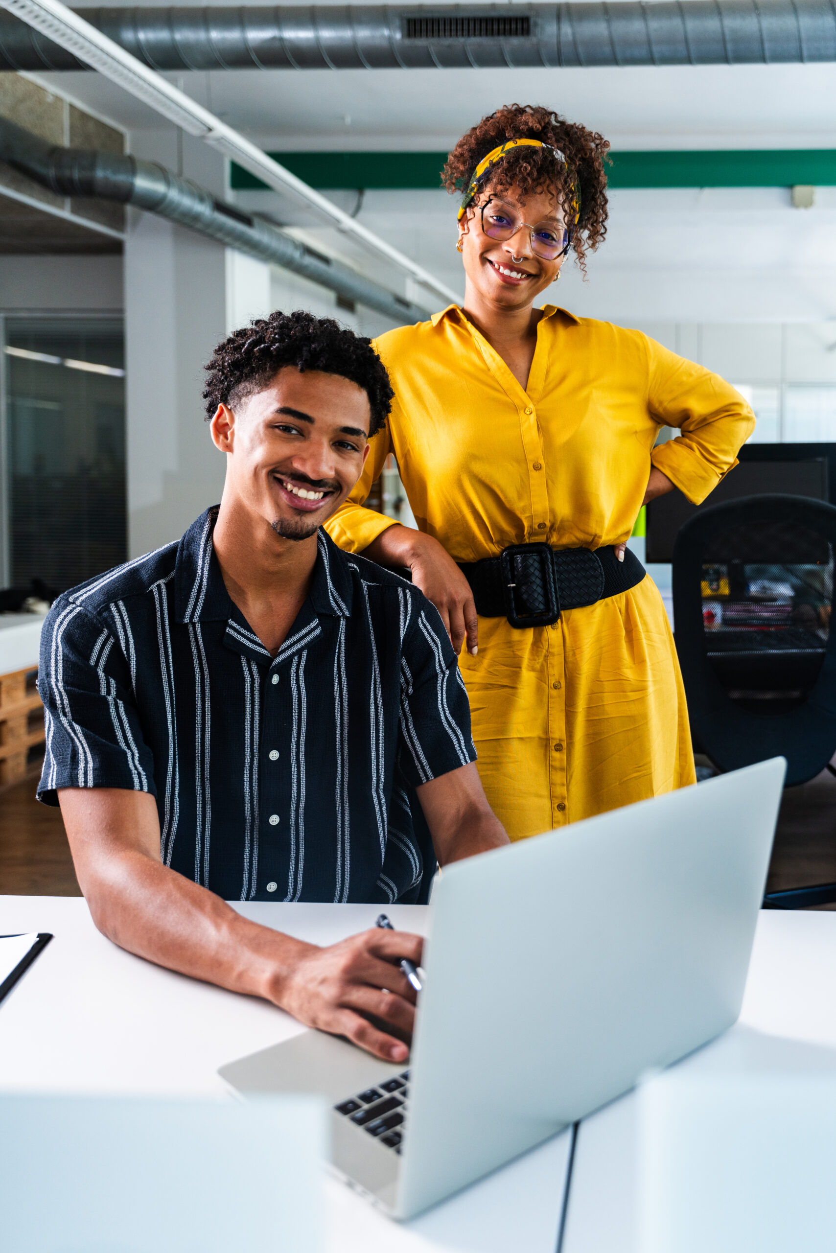 Two young professionals collaborating on a project, using a laptop in a bright, modern office space, demonstrating teamwork and innovation in their startup company